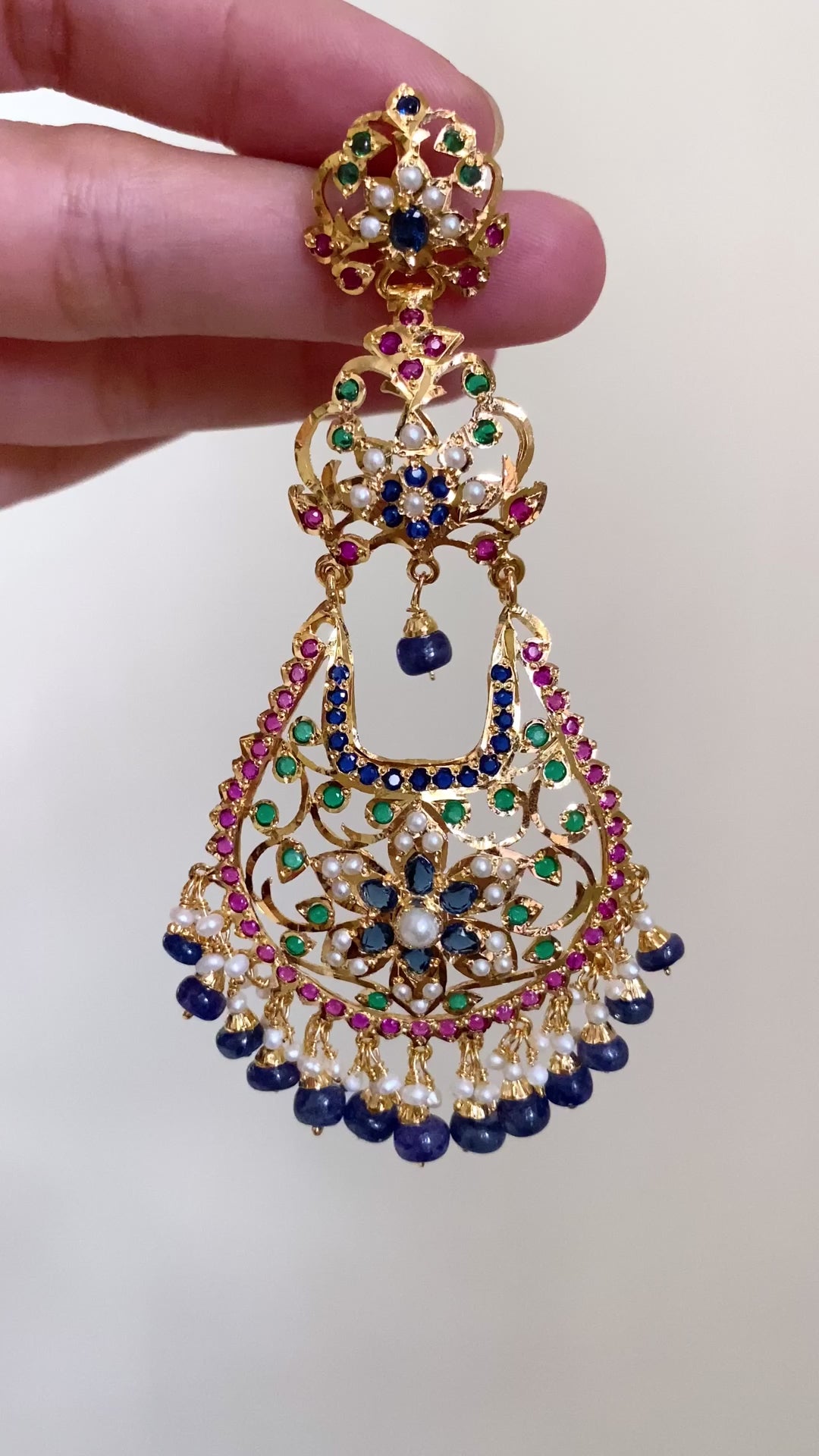 The earrings are nearly 9cms tall and close with a bombay screw. The metal is 925 silver, gold plated. The studded stones are freshwater pearls and red-blue-green stones that closely resemble rubies, sapphires and emeralds. The hanging beads are real blue sapphires and freshwater pearls.